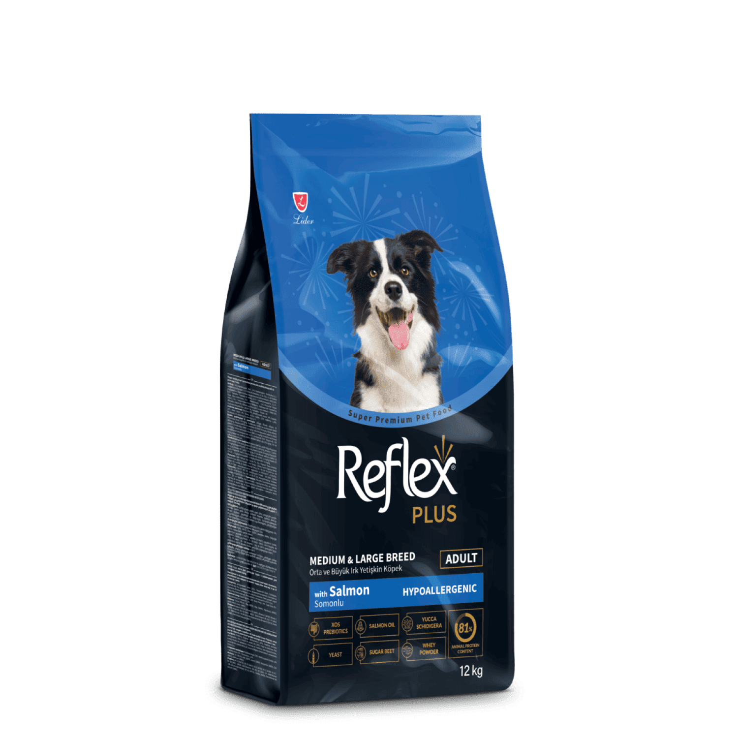 Reflex Plus Medium & Large Breed Adult з лососем – це повноцінний і збалансований сухий корм супер преміум класу, розроблений спеціально для дорослих собак середніх та великих порід віком від 18–24 місяців до 7 років. Високоякісне м’ясо лосося є легкозасвоюваним джерелом білка та незамінних омега‑3 жирних кислот, що сприяють здоров’ю шкіри, блиску шерсті та нормальній роботі серцево-судинної системи. Формула збагачена життєво важливими вітамінами, мінералами, пребіотиками та антиоксидантами, які зміцнюють імунітет, підтримують здоров’я суглобів і сприяють активному, енергійному життю вашого улюбленця.